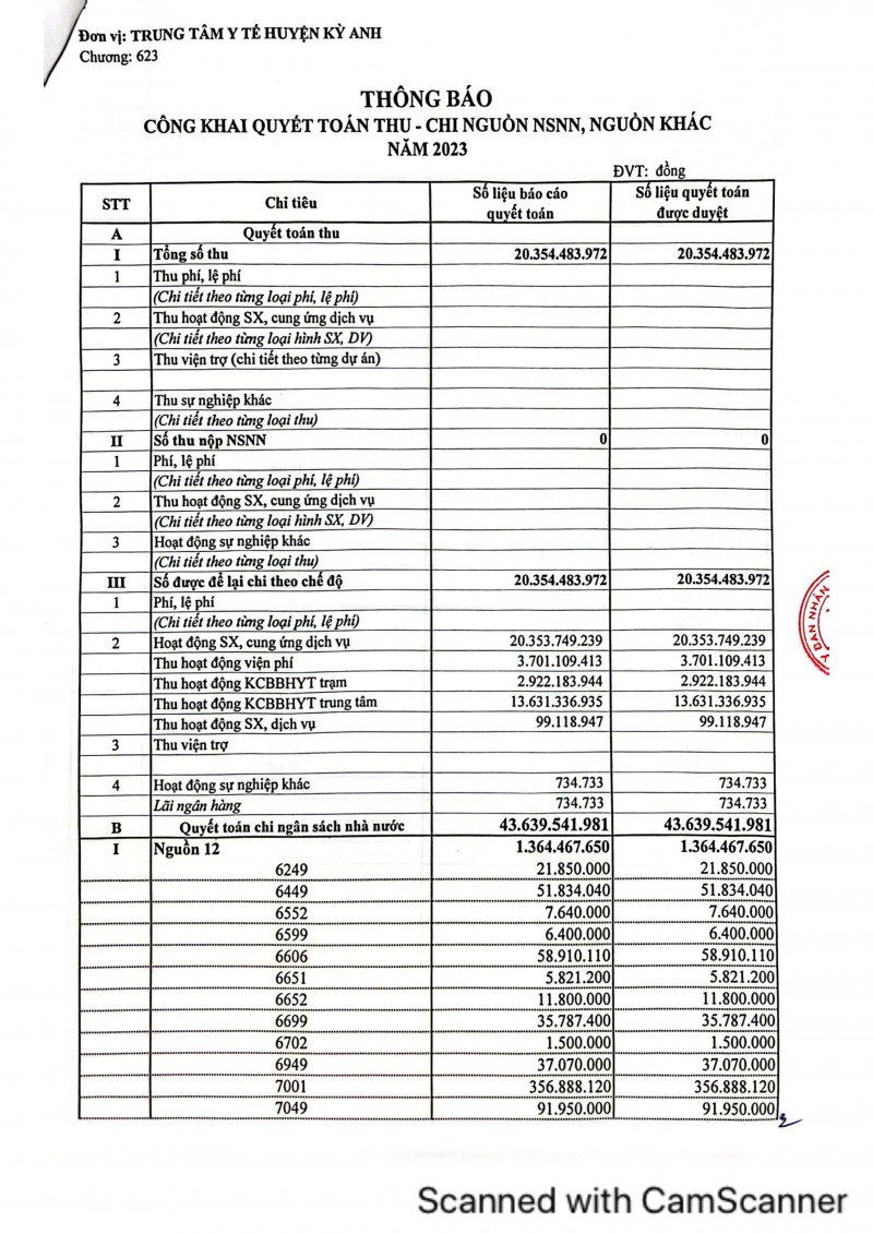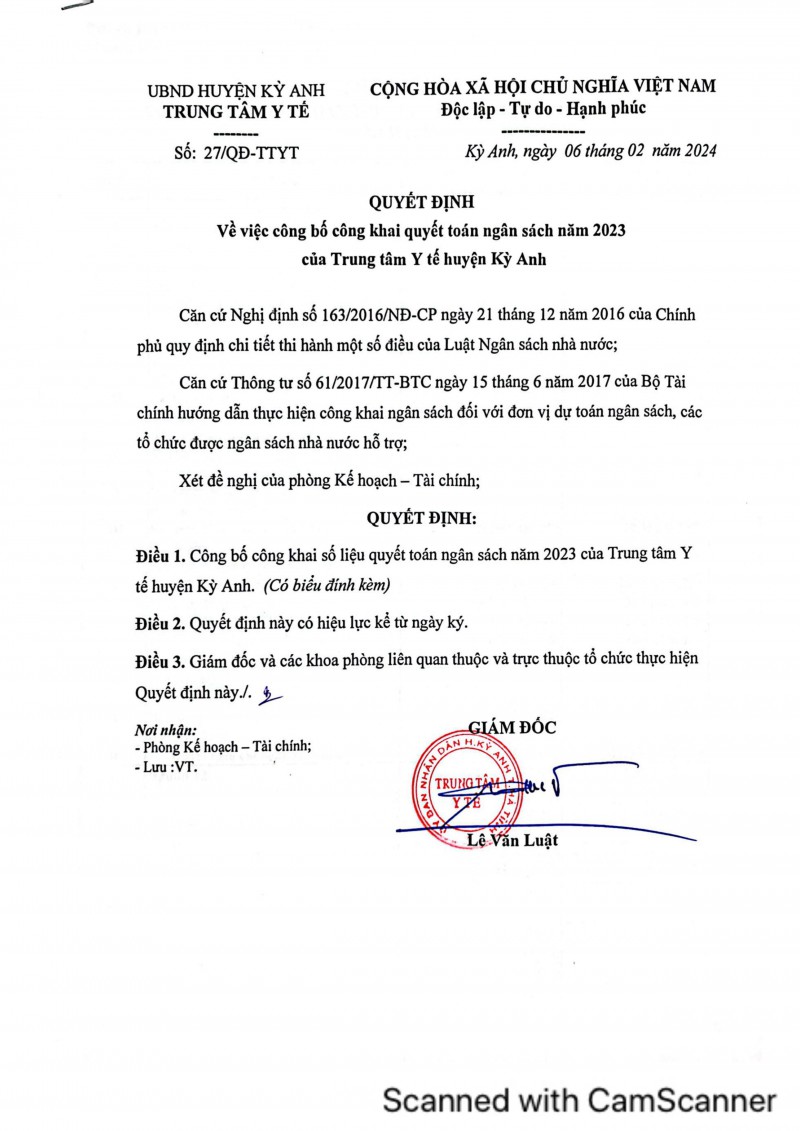 Quyết định về việc công bố công khai quyết toán ngân sách năm 2023 của Trung tâm Y tế huyện Kỳ Anh