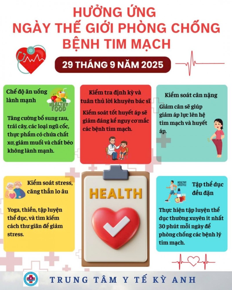 Ngày Tim mạch Thế giới được tổ chức vào ngày 29/9 hàng năm để nâng cao nhận thức cộng đồng về các bệnh tim mạch và khuyến khích mọi người thực hiện các biện pháp phòng ngừa. Sự kiện này là lời nhắc nhở về tầm quan trọng của việc bảo vệ trái tim thông qua các hành động như kiểm soát huyết áp, duy trì chế độ ăn uống lành mạnh, tập thể dục đều đặn và khám sức khỏe định kỳ.