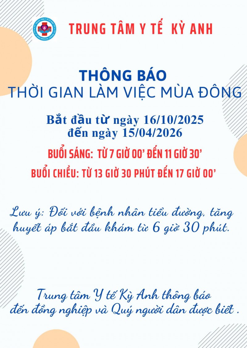 Trung tâm Y tế Kỳ Anh trân trọng thông báo thời gian làm việc mùa đông bắt đầu từ ngày 16/10/2025 đến ngày 15/4/2026