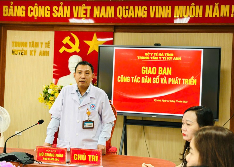Thực hiện chương trình công tác tháng 11, sáng ngày 12/11/2025 Trung tâm Y tế Kỳ Anh tổ chức hội nghị giao ban Dân số và phát triển. Nội dung đánh giá kết quả hoạt động 10 tháng đầu năm; triển khai nhiệm vụ trọng tâm 2 tháng cuối năm 2025. Tham dự giao ban về phía Trung tâm Y tế có đồng chí Hồ Giang Nam, Phó Giám đốc, phụ trách ngoại viện (chủ trì); các đồng chí viên chức phòng Dân số - truyền thông và cán bộ chuyên trách Dân số tại 20 xã.