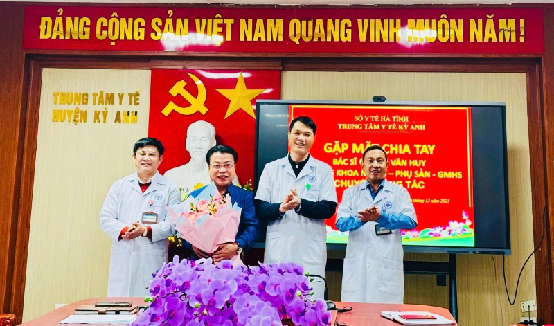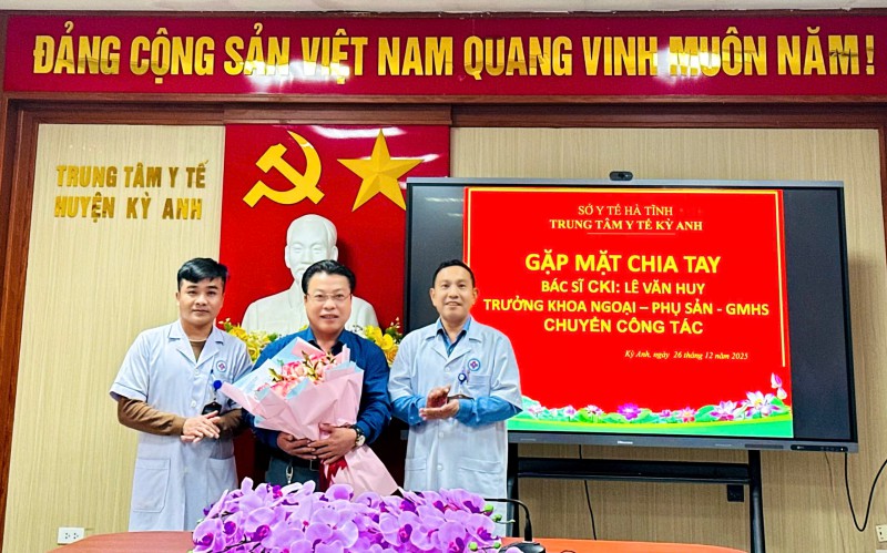 Sáng ngày 26/12/2025, Trung tâm Y tế Kỳ Anh tổ chức buổi gặp mặt chia tay đồng chí Lê Văn Huy, Trưởng khoa Ngoại – Phụ sản – Gây mê hồi sức chuyển công tác đến đơn vị mới. Tham dự buổi gặp mặt có các đồng chí trong Ban Chấp hành Đảng ủy; Ban Giám đốc Trung tâm; Trưởng/ phó các khoa, phòng; Điều dưỡng/Kỹ thuật viên trưởng cùng đại diện các bộ phận chuyên môn.