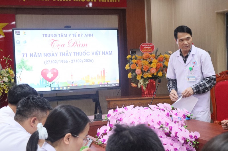 Hòa chung không khí thi đua sôi nổi của ngành Y tế cả nước hướng tới kỷ niệm 71 năm Ngày Thầy thuốc Việt Nam (27/2/1955 – 27/2/2026), Chiều ngày 26/02/2026, Trung tâm Y tế Kỳ Anh long trọng tổ chức Lễ Tọa đàm kỷ niệm 71 năm Ngày Thầy thuốc Việt Nam. Tham dự buổi lễ có các đồng chí trong BCH Đảng ủy, Ban Giám đốc, Trưởng/Phụ trách các khoa, phòng cùng đại diện cán bộ, viên chức, người lao động trong Trung tâm.