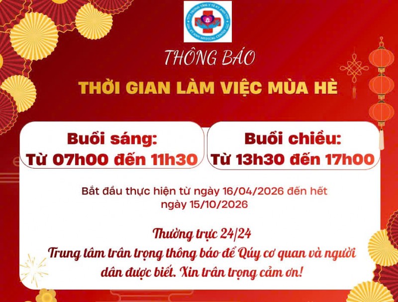 Trung tâm Y tế Kỳ Anh trân trọng thông báo thời gian làm việc theo giờ hành chính mùa hè từ ngày 16/04/2026 đến hết ngày 15/10/2026 như sau: